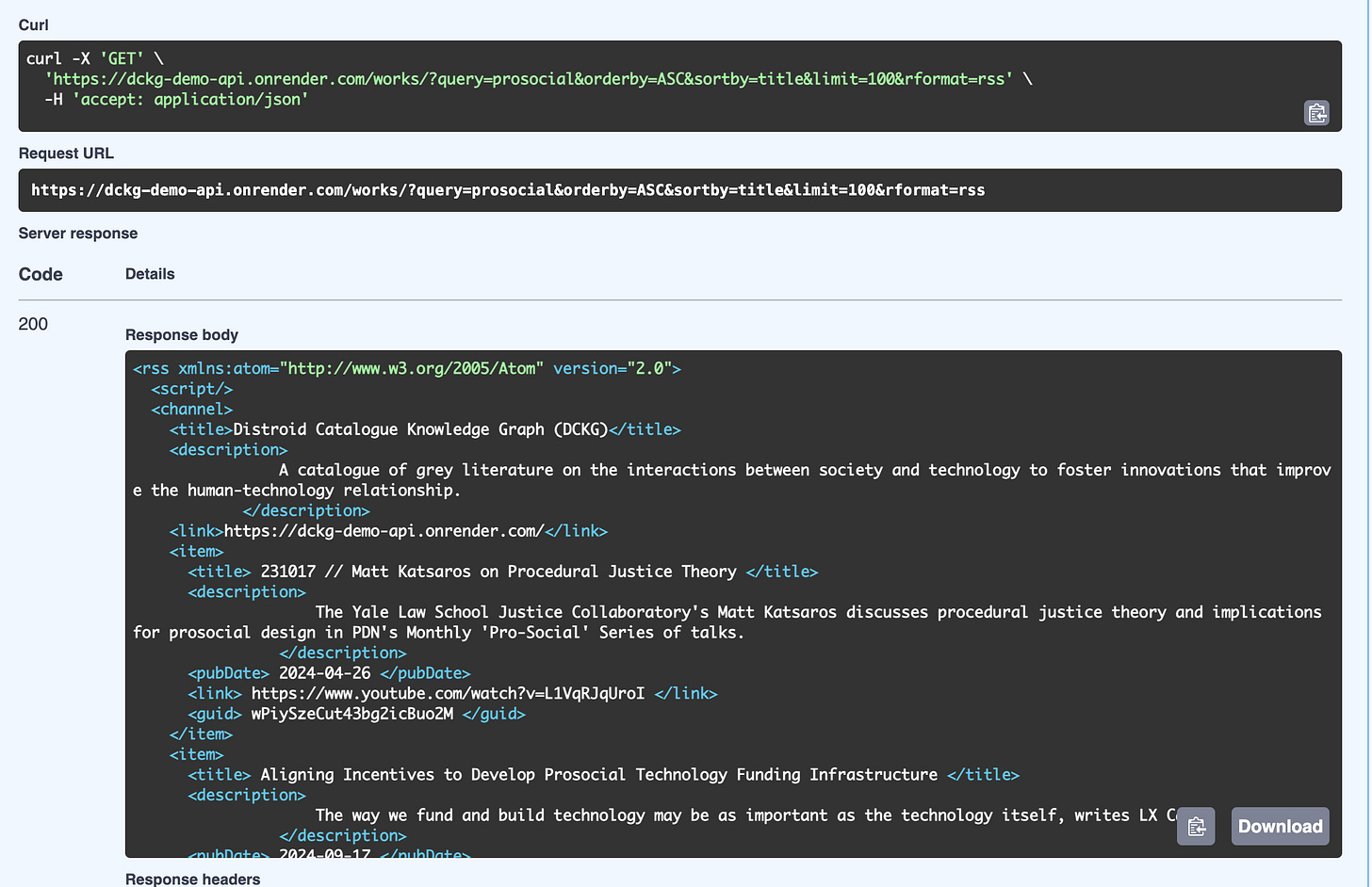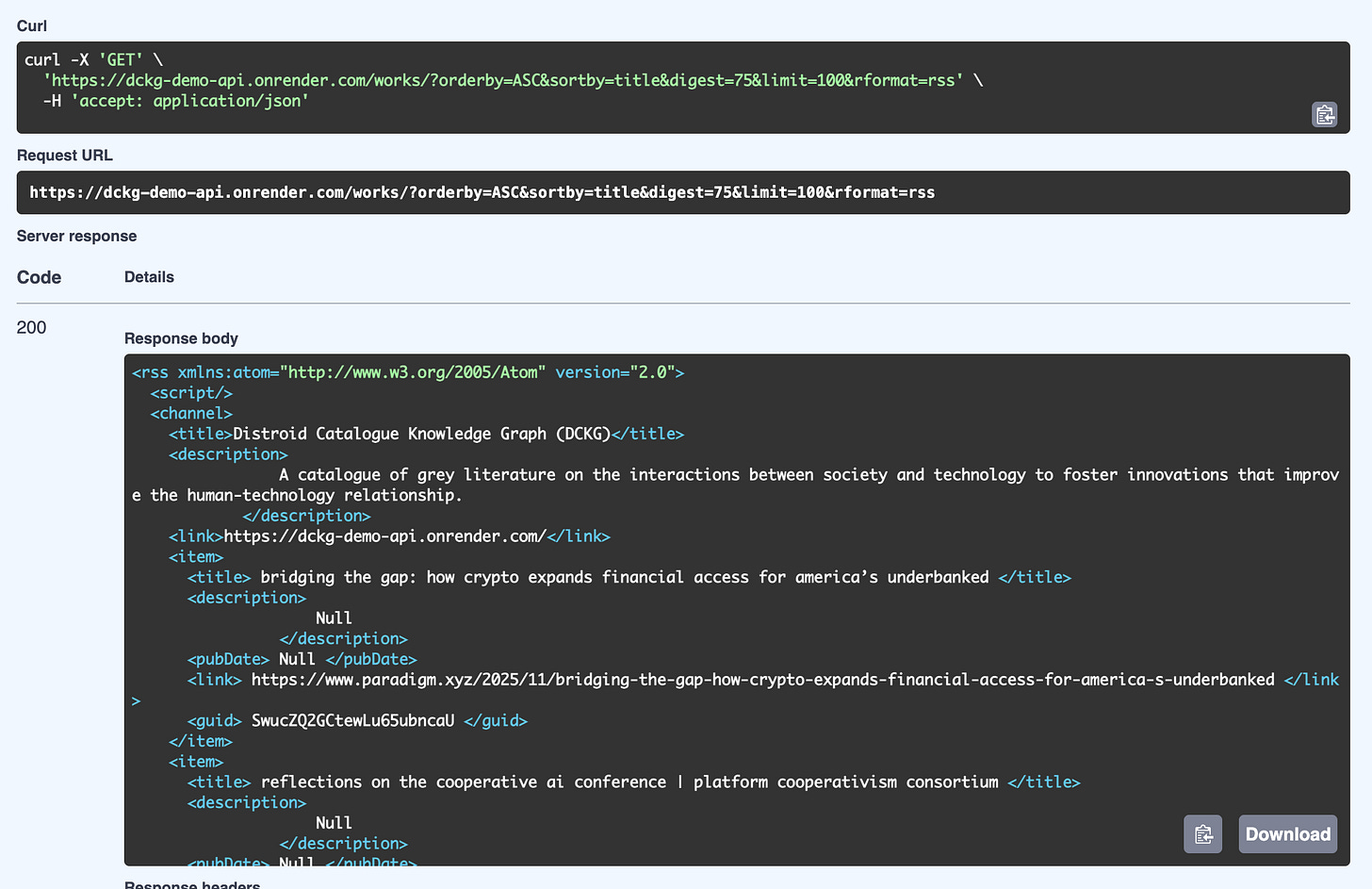 Recently, I added an option for returning results from the /works/ endpoint for the DCKG API in RSS format.